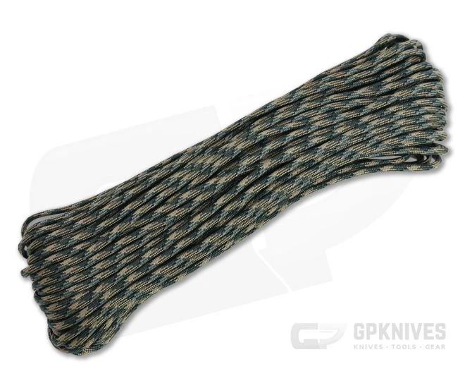 Woodland Camo nylon paracord in a 100 foot hank. 550 pound test with a 7 strand core. This Type III commercial nylon paracord is produced in the United States by a certified US Government Contractor.