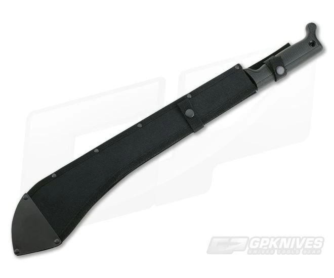 The Blade: The Bolo is made from carbon steel with a black matte coating to prevent rust. The extra mass at the tip carries considerable weight for effective chopping.