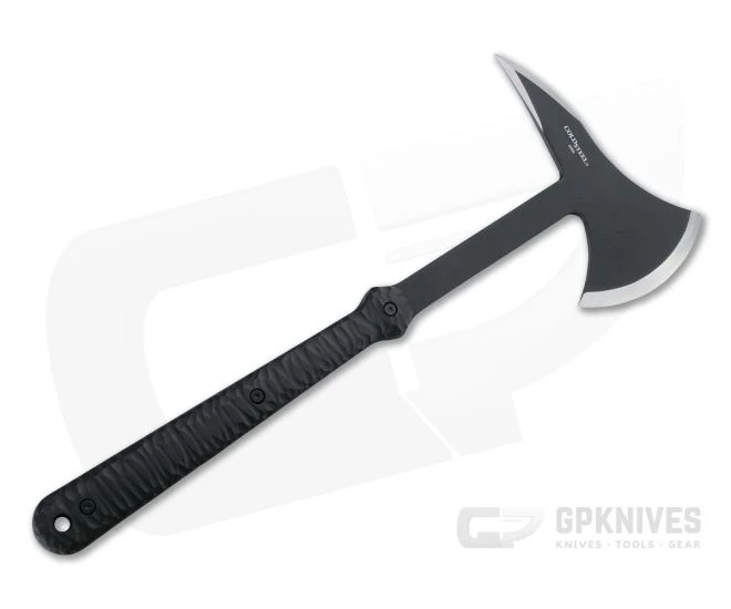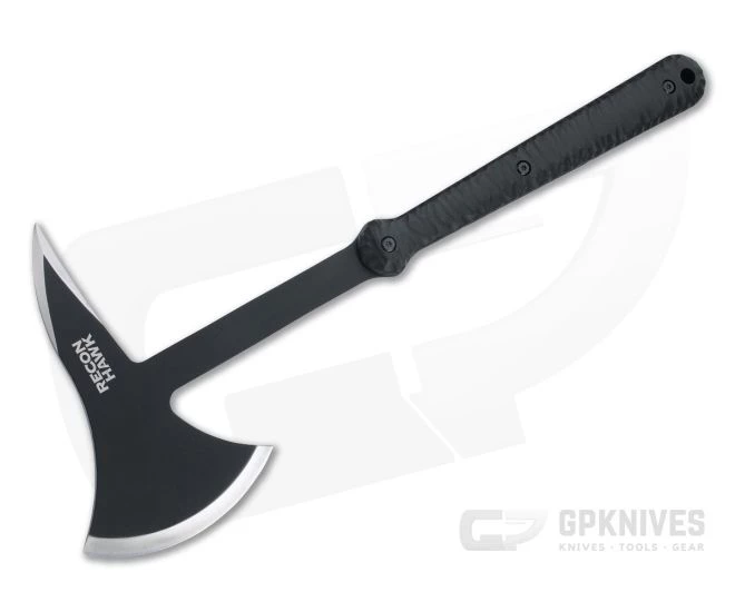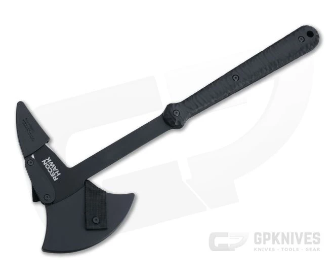 Designed by custom knife maker Andrew Demko, the Cold Steel Recon Hawk is a robust, multi-functional tool perfect for throwing, outdoor and combat use. A piercing spike pole sits opposite the sweeping edge of the head all made from rugged 65Mn carbon steel with black powder coating. A textured nylon handle and articulated Secure-Ex polymer sheath make this a versatile and functional chopping tool whatever your use.