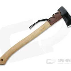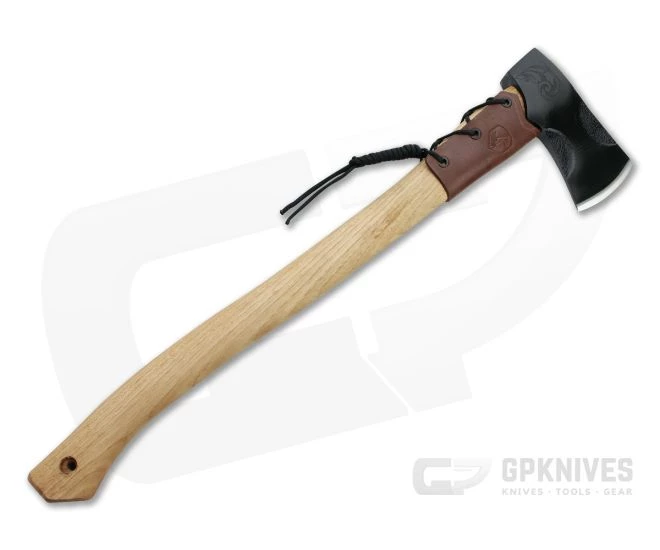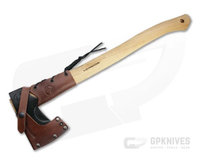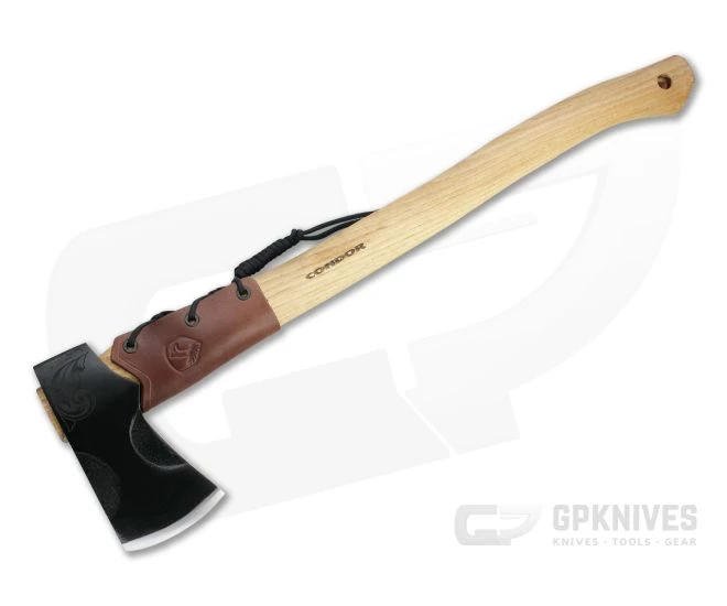 Naturalist and avid outdoor enthusiast Joe Flowers delivers another successful collaborative design in the Condor Tool & Knife Cloudburst Axe. A strong American hickory handle supports the 1060 carbon steel head with protective black coating and stylish filigree engraving around the eye. The straight, narrow bit has a deep, precise bite and can easily be used for carving tasks thanks to a leather grip tied at the shoulder of the handle. A snap closure welted leather cover allows for safe carry and transport.