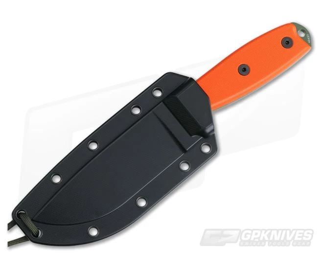 ESEE 4 with a plain edge and olive drab traction coated 1095 tool steel blade. This ESEE 4 has a full tang with textured orange G10 handle scales attached with allen screws. Along the spine of the blade, where the thumb rests, jimping has been added to provide an improved grip. Each knife has been individually serialized on the rounded pommel. Includes a black molded sheath, MOLLE locks, paracord and a cord lock. The knife snaps tightly into it’s sheath allowing for inverted carry. The ESEE 4 is a bit longer and wider than the 3, making it the perfect backpacking and survival knife. A survival business card and instruction sheet has been packaged with the knife that helps to explain the many carry options of the knife.