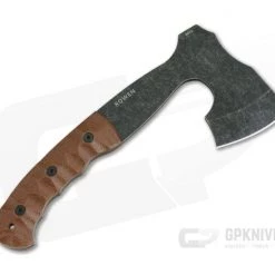 The ESEE outdoors line gets another great design from outdoor enthusiast James Gibson in the Carving Axe. It sports a similar style as the PR4 with black stonewashed finished 1095 high carbon tool steel and sculpted brown canvas Micarta handle scales making them a great outdoor Bushcraft pairing.