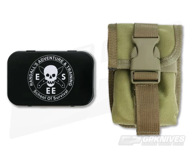 ESEE Knives Khaki Accessory Pouch manufactured from durable Cordura fabric. The pouch will bolt to the front of the ESEE 5 or ESEE 6 hard sheath. Each pouch is equipped to hold the included storage tin with hardware or a standard sized Altoids tin. 4 screws and posts for attachment.
