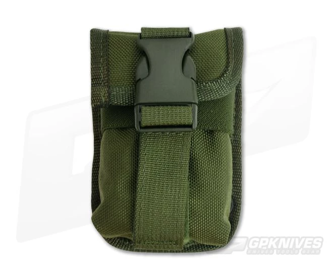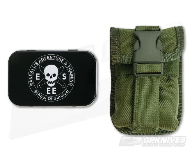 ESEE Knives OD Green Accessory Pouch manufactured from durable Cordura fabric. The pouch will bolt to the front of the ESEE 5 or ESEE 6 hard sheath. Each pouch is equipped to hold the included storage tin with hardware or a standard sized Altoids tin. 4 screws and posts for attachment.