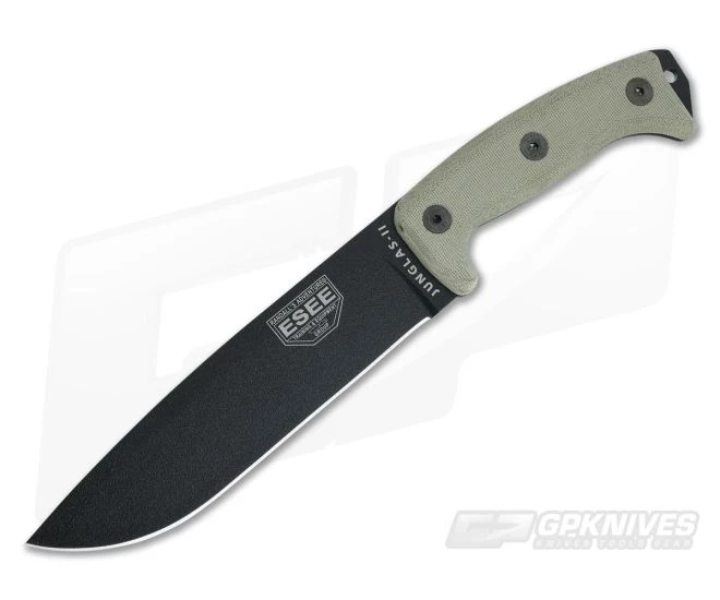 The ESEE Junglas II is just like the original Junglas, a hybrid between a large knife and a machete, now available in a more compact package. You get the same robust construction with a full tang 1095 high carbon tool steel blade and canvas Micarta handle slabs, just 2 inches shorter. The Junglas II comes with a black powder coated blade and carries via a secure molded Kydex sheath with nylon MOLLE back. Proudly made in the USA.