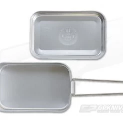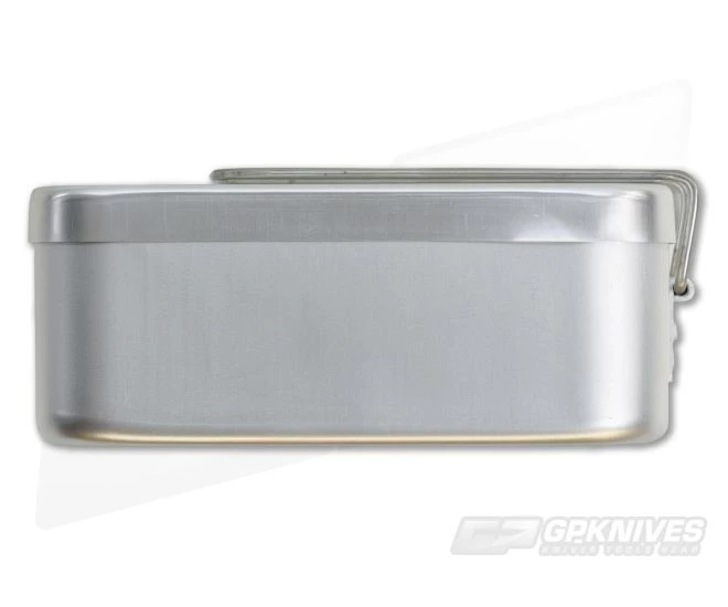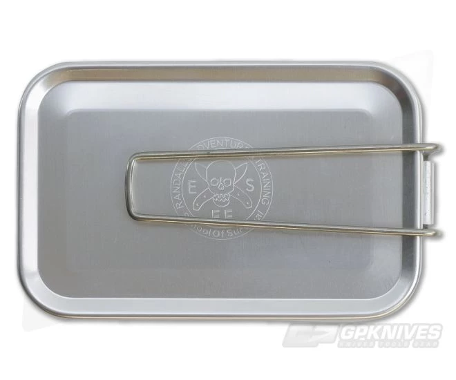 The ESEE large mess/survival Tin can easily hold your own pocket-sized survival kit, as well as, either ESEE Basic or Advanced Survival Kits. Besides storage, the aluminum box has a folding handle that allows it to be used a a make shift cooking pot. Great for boiling water or cooking meals in. The lid proudly displays an embossed Randall’s Adventure & Training ESEE logo on the top. Brand new direct from ESEE.