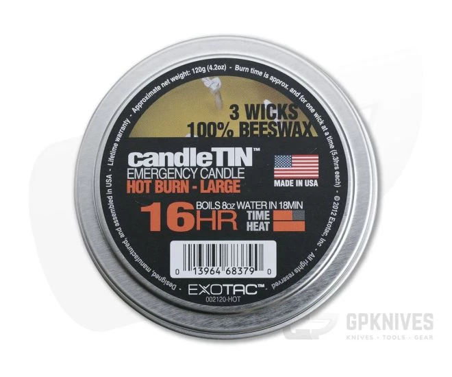 Exotac candleTIN Large 16 hour Hot Survival Candle is hand crafted from 100% beeswax to provide an instant source of heat and light. The hot burn wick provides a flame height of 1-2″ and can be used for drying out tinder, boiling water, or warming an emergency blanket. Beeswax offers a brighter light and will burn cleaner than any other wax. Utilizing all 3 wicks this candle will boil 8oz of water in 18 minutes and will burn for two hours. Use a single wick for a full 16 hour burn time (~5.3 hours each). Exercise caution when using all three wicks as the tin becomes hot to the touch.