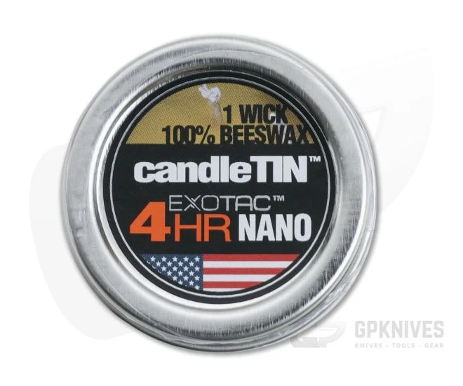 Exotac candleTIN Nano 4 hour Survival Candle is hand crafted from 100% beeswax to provide a hotter and longer burn than paraffin. Beeswax offers a brighter light and burn cleaner than any other wax. The Nano is a lightweight version of the larger candleTIN candles in a standard tealight size. This packable version is light enough to carry in a first aid kit or throw in a pack while delivering at least 4 hours of burn time each. This 3-Pack includes 3 x candleTIN Nano candles.