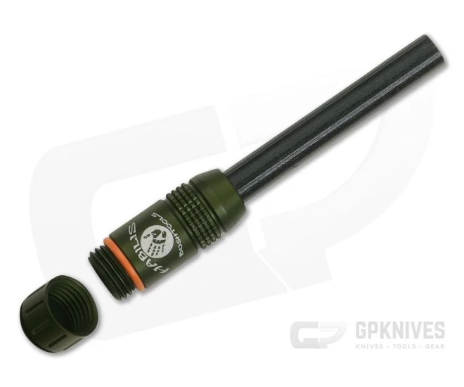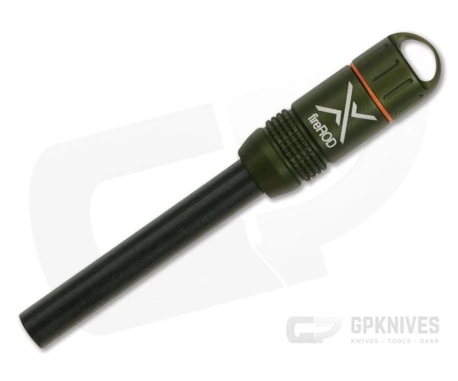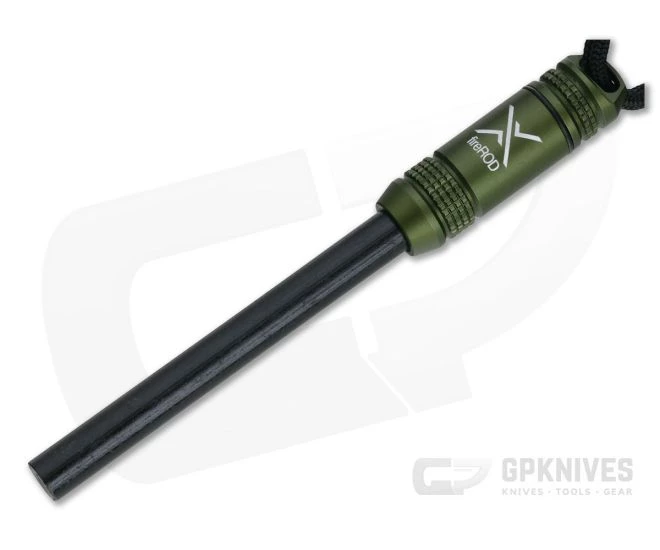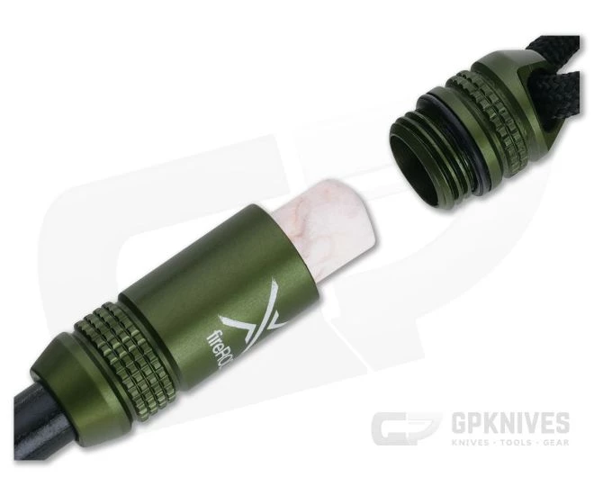 The Exotac fireROD Version2 is a compact ferrocerium rod attached to a waterproof tinder capsule. The replaceable 3.1″ x 5/16″ thick ferrocerium rod burns at nearly 5550 degrees Fahrenheit and even works when wet. The tinder capsule is made from lightweight aluminum that has been hard anodized and is sealed with an O-ring offering dry storage of tinder or water purification tabs. The whole unit is compact enough to fit on fixed blade knife sheaths that support a ferro rod. Includes quickLIGHT Tinder (2) and Fire Cord Lanyard. This version is anodized OD Green.