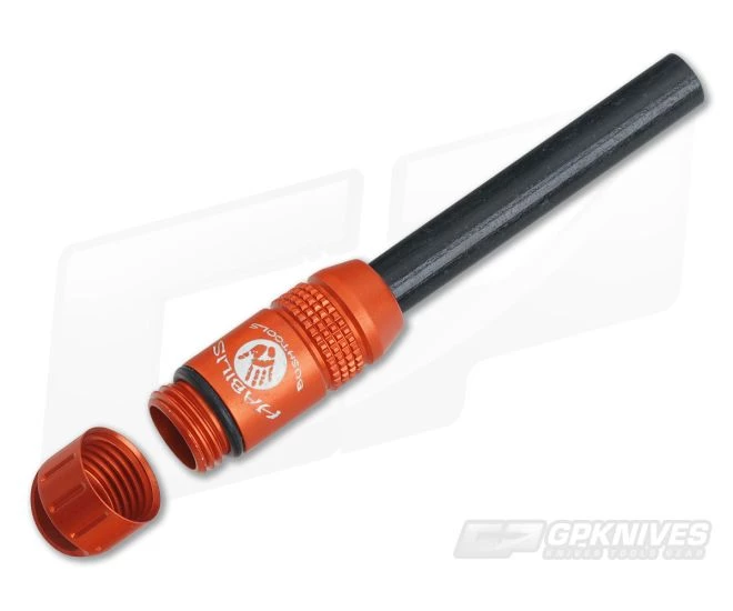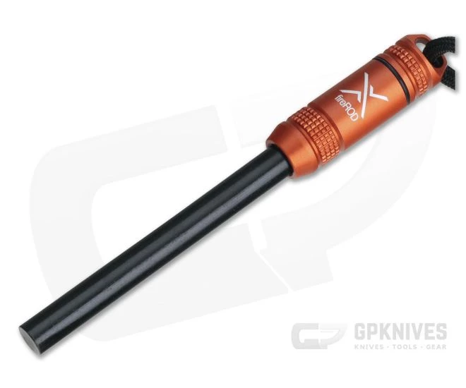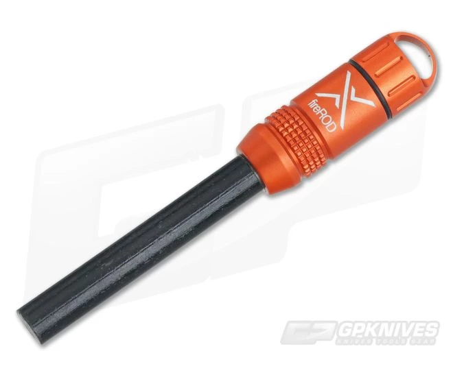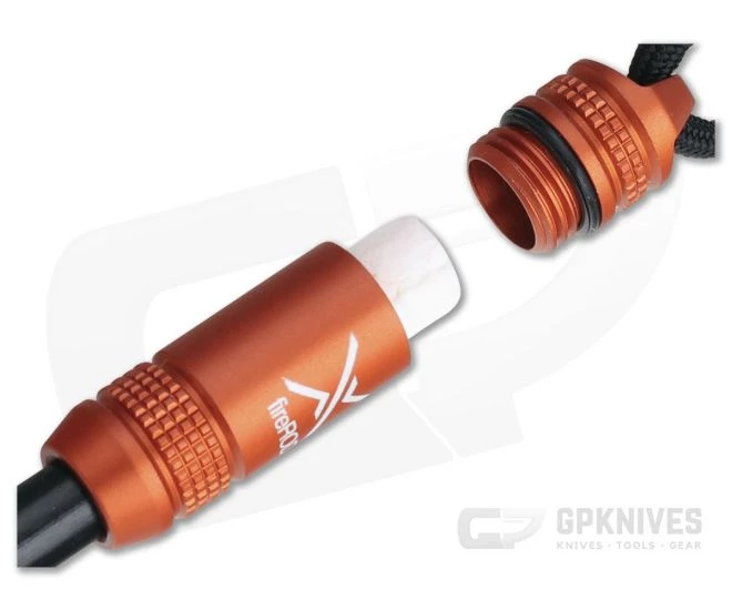 The Exotac fireROD Version2 is a compact ferrocerium rod attached to a waterproof tinder capsule. The replaceable 3.1″ x 5/16″ thick ferrocerium rod burns at nearly 5550 degrees Fahrenheit and even works when wet. The tinder capsule is made from lightweight aluminum that has been hard anodized and is sealed with an O-ring offering dry storage of tinder or water purification tabs. The whole unit is compact enough to fit on fixed blade knife sheaths that support a ferro rod. Includes quickLIGHT Tinder (2) and Fire Cord Lanyard. This version is anodized Orange.