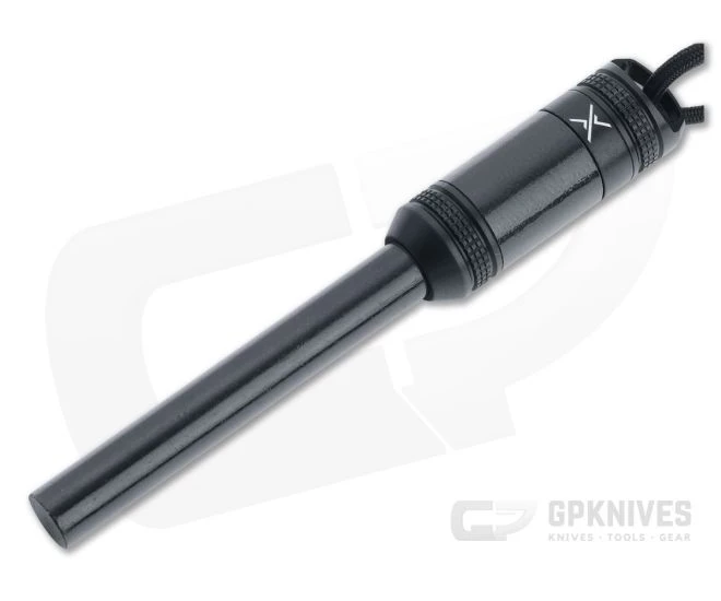 The replaceable 1/2″ thick rod burns at nearly 5550 degrees Fahrenheit and even works when wet. The tinder capsule houses the included quickLIGHT dry-treated cotton tinder bundles (4), is wrapped in black repair tape, which has a variety of uses including being a flammable tinder and has an attached paracord lanyard. An ideal pairing with your bushcraft knife or outdoor emergency kit. This version is anodized classic black.