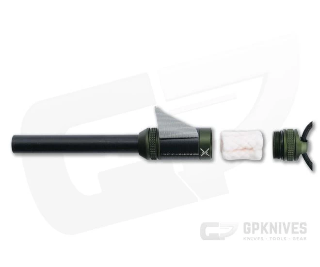 The replaceable 1/2″ thick rod burns at nearly 5550 degrees Fahrenheit and even works when wet. The tinder capsule houses the included quickLIGHT dry-treated cotton tinder bundles (4), is wrapped in black repair tape, which has a variety of uses including being a flammable tinder and has an attached paracord lanyard. An ideal pairing with your bushcraft knife or outdoor emergency kit. This version is anodized olive drab “OD” green.