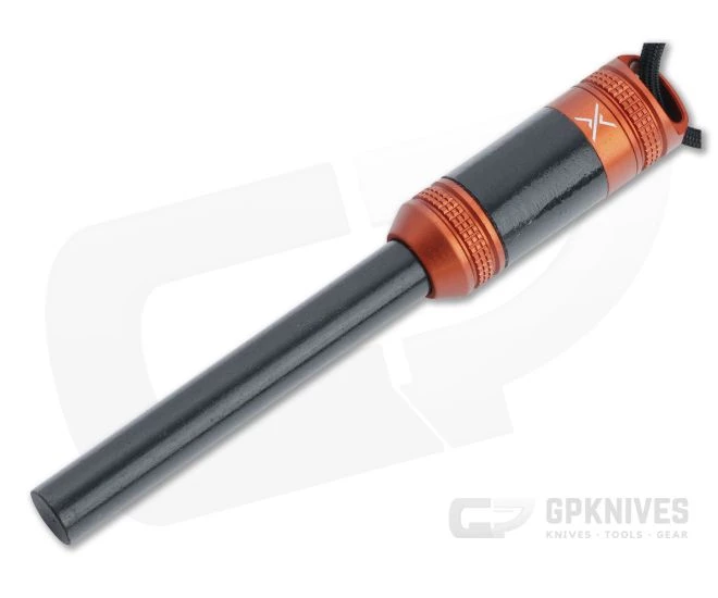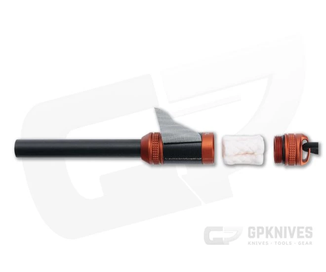 The replaceable 1/2″ thick rod burns at nearly 5550 degrees Fahrenheit and even works when wet. The tinder capsule houses the included quickLIGHT dry-treated cotton tinder bundles (4), is wrapped in black repair tape, which has a variety of uses including being a flammable tinder and has an attached paracord lanyard. An ideal pairing with your bushcraft knife or outdoor emergency kit. This version is anodized classic orange.
