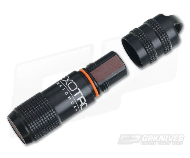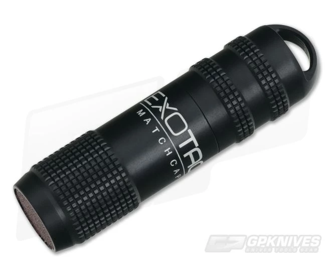 The Exotac MatchCap Black is the perfect addition to a survival kit or for attachment to gear. The capsule is made of lightweight aluminum that has been anodized black. The aluminum has been textured for a secure grip in wet or dry weather. A red phosphorus striker is found on the bottom as well as beneath the cap. It holds 20 kitchen matches, 16 NATO matches or 12 REI stormproof matches which can all be up to 72 mm in length. The capsule is o-ring sealed to keep your matches dry up to 5 meters below water. The package includes extra O-rings, extra match strikers, lanyard cord and an instruction manual.