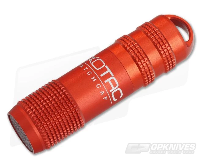 The Exotac MatchCap Blaze Orange is the perfect addition to a survival kit or for attachment to gear. The capsule is made of lightweight aluminum that has been anodized blaze orange. The aluminum has been textured for a secure grip in wet or dry weather. A red phosphorus striker is found on the bottom as well as beneath the cap. It holds 20 kitchen matches, 16 NATO matches or 12 REI stormproof matches which can all be up to 72 mm in length. The capsule is o-ring sealed to keep your matches dry up to 5 meters below water. The package includes extra O-rings, extra match strikers, lanyard cord and an instruction manual.
