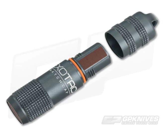 The Exotac MatchCap is the perfect addition to a survival kit or for attachment to gear. The capsule is made of lightweight aluminum that has been anodized gunmetal gray. The aluminum has been textured for a secure grip in wet or dry weather. A red phosphorus striker is found on the bottom as well as beneath the cap. It holds 20 kitchen matches, 16 NATO matches or 12 REI stormproof matches which can all be up to 72 mm in length. The capsule is o-ring sealed to keep your matches dry up to 5 meters below water. The package includes extra O-rings, extra match strikers, lanyard cord and an instruction manual.