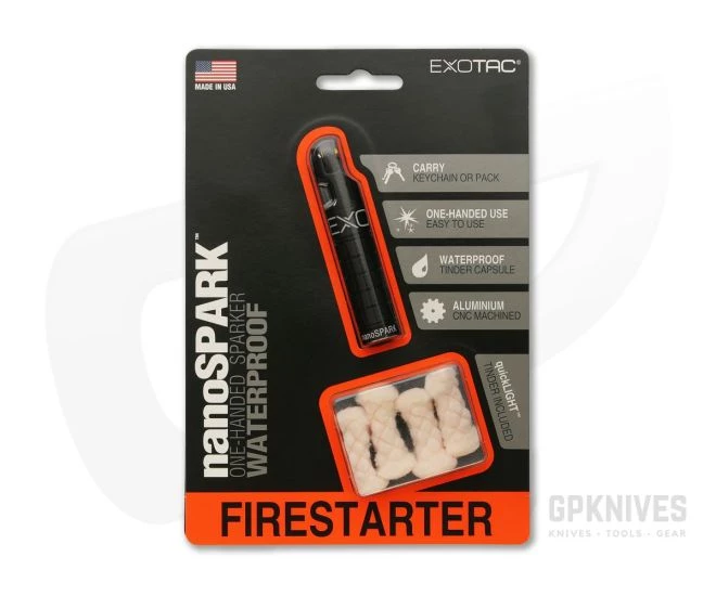 The Exotac nanoSPARK Black is a single-hand operation sparker that is ultra-durable, lightweight and waterproof making it a perfect addition your survival kit or outdoor EDC. The body is made of lightweight aluminum that has been anodized black and textured for exceptional grip. An O-Ring keeps the tinder capsule waterproof to +1 meter. The high-spark flint wheel delivers up to 500 strikes for easy ignition of the included quickLIGHT tinder. The flint is easily accessed for replacement via a thumb screw inside the durable, square-thread tinder capsule. A lanyard hole/keychain attachment point allows for easy attachment to other gear so your nanoSPARK is always close to hand.