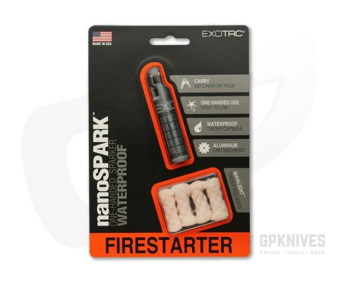 The Exotac nanoSPARK Gunmetal is a single-hand operation sparker that is ultra-durable, lightweight and waterproof making it a perfect addition your survival kit or outdoor EDC. The body is made of lightweight aluminum that has been anodized Gunmetal Gray and textured for exceptional grip. An O-Ring keeps the tinder capsule waterproof to +1 meter. The high-spark flint wheel delivers up to 500 strikes for easy ignition of the included quickLIGHT tinder. The flint is easily accessed for replacement via a thumb screw inside the durable, square-thread tinder capsule. A lanyard hole/keychain attachment point allows for easy attachment to other gear so your nanoSPARK is always close to hand.