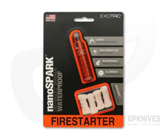 The Exotac nanoSPARK Orange is a single-hand operation sparker that is ultra-durable, lightweight and waterproof making it a perfect addition your survival kit or outdoor EDC. The body is made of lightweight aluminum that has been anodized Blaze Orange and textured for exceptional grip. An O-Ring keeps the tinder capsule waterproof to +1 meter. The high-spark flint wheel delivers up to 500 strikes for easy ignition of the included quickLIGHT tinder. The flint is easily accessed for replacement via a thumb screw inside the durable, square-thread tinder capsule. A lanyard hole/keychain attachment point allows for easy attachment to other gear so your nanoSPARK is always close to hand.