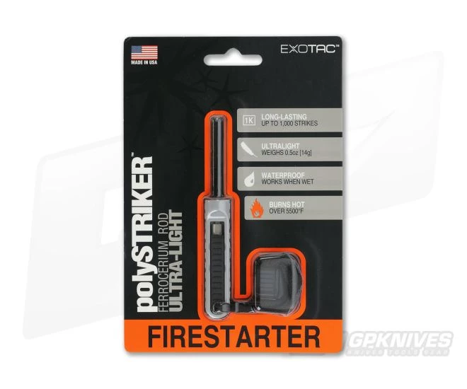 The Exotac polySTRIKER Fire Starter in Gray/Black is a waterproof ultra-light fire starting tool. It works by combining a ferrocerium rod with an integrated snap-in sharp tungsten carbide striker. Burns at nearly 5500 degrees Fahrenheit and gives you 1500 fire-starting strikes in nearly any weather. Includes attached lanyard.