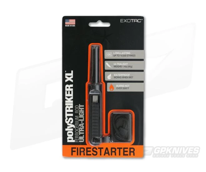 The Exotac polySTRIKER XL Fire Starter in Black is a larger version waterproof ultra-light fire starting tool. It works by combining a ferrocerium rod with an integrated snap-in sharp tungsten carbide striker. Burns at nearly 5500 degrees Fahrenheit and gives you 10,000 fire-starting strikes in nearly any weather. Includes attached lanyard.
