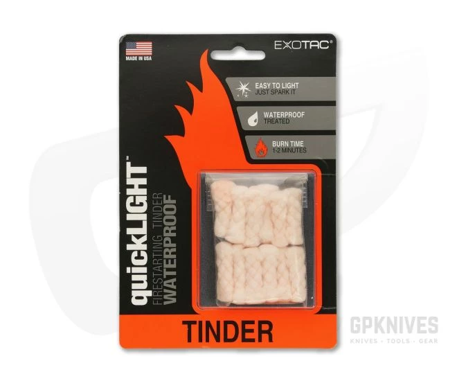 Exotac quickLIGHT is a compact, waterproof, fire starting tinder that lights easily and burns 1-2 minutes to get your fire going in the worst conditions. Can be used with a fire-starter, matches or a lighter. Makes a great accessory to the Exotac nanoSPARK.