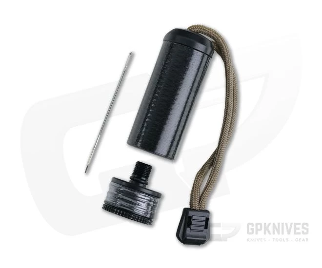 The Exotac ripSPOOL is a collaborative design between Battlbox founder Daniel Dabbs and Rob at Exotac. Starting out as an easy way to carry duct tape, the ripSPOOL evolved into a unique, useful, comprehensive and uncompromising field repair kit. This is a lightweight field repair kit that can also be used for multiple survival and bushcraft tasks including: first aid, fire starting, fishing and navigation. The needle storage area offers enough additional space to customize the ripSPOOL by adding small emergency fishing gear and safety pins. The #16 sail needle can be magnetized to be used as an improvised compass. This version has a Black anodized aluminum body.