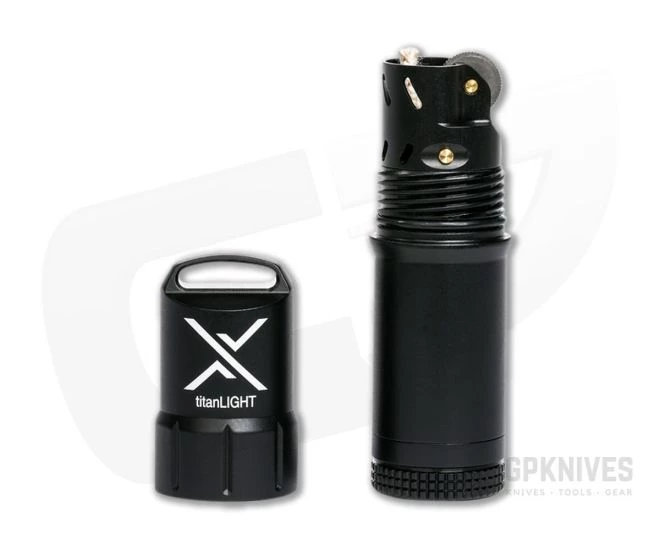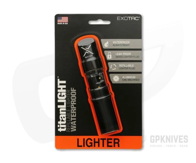 The Exotac titanLIGHT Black is an extra large, precision machined “peanut” style lighter that is ultra-durable, lightweight and waterproof making it a perfect addition your survival or outdoor adventure kit. The body is made of lightweight aluminum that has been anodized black. Dual O-Rings prevent fuel leakage and keep the lighter waterproof to +1 meter. A built in wind guard, high-spark flint wheel and convection-assist combustion make for fast and sure lighting while the quickTHREAD cap gives you 1-revolution access and closure. The bottom cap is removable for refueling and replacing flint and wick for a lifetime of use. Uses Zippo-style lighter fluid (not included).
