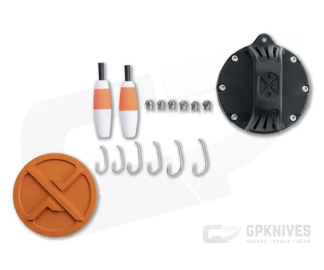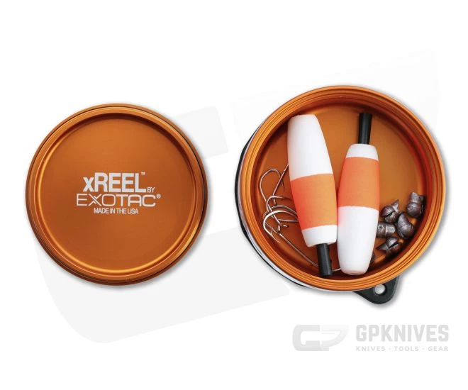 Exotac delivers quality and innovation with their xREEL pocket fishing kit. The anodized 6061 aluminum body is lightweight and durable, with an internal compartment that houses your tackle. On the exterior is a TPE rubber strap that serves as a handle with lanyard attachment point. Near the strap base, the circumference of the body has milled hook parking holes and a wide channel for line, 50 feet of 30-lb test mono-filament included. Compact and lightweight at under 5 ounces, the xREEL is great to toss into a pocket, pack, or survival kit for small fish acquisition. This version comes anodized orange.