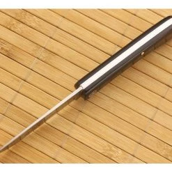 Thick, contoured black micarta handle scales have been pinned to stainless steel liners and secured with a brass lanyard tube/steel pivot pin. The Micarta is chamfered for a comfortable feel in-hand while the black coloring won’t show signs of wear.Â