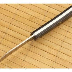 The Handle: Thick, contoured Black linen Micarta handle scales have been pinned to stainless steel liners and secured with a brass lanyard tube, pin and steel pivot pin. The Micarta is chamfered for a comfortable feel in-hand while the black coloring won’t show signs of wear. The butt end of the handle sweeps up to balance out the blade.