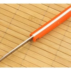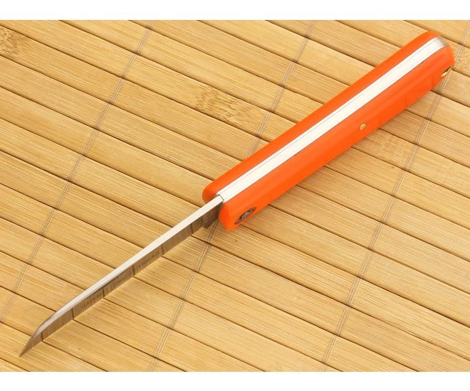 The Handle: Thick, durable orange Delrin handle scales have been pinned to stainless steel liners and secured with a brass lanyard tube, pin and steel pivot pin. The Delrin is chamfered for a comfortable feel in-hand while the safety orange does its best to help you never lose it. The butt end of the handle sweeps up to balance out the blade.