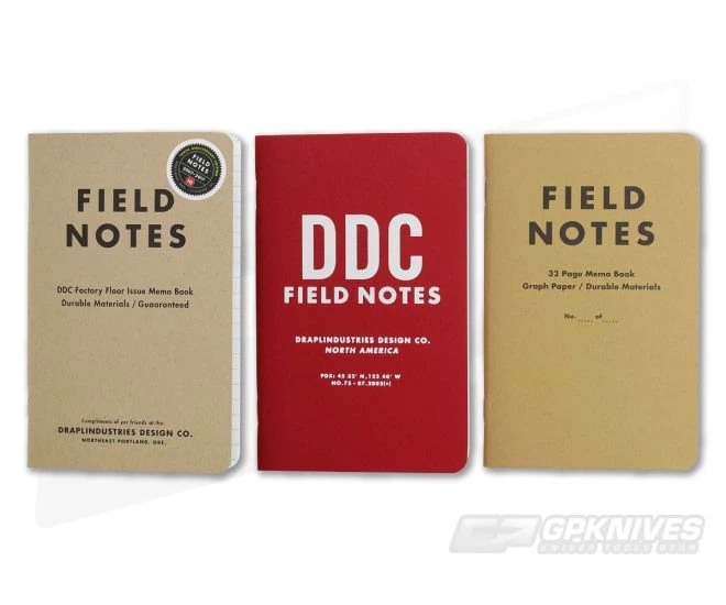 The original version of this small notebook with a red-leather-textured hard cover that Field Notes creator Aaron Draplin customized with his Gocco desktop screen printing press, circa 2002. This was Aaron’s first use of the name “FIELD NOTES,” and the first use of the horizontal Futura Field Notes logo. The original version had white print on the cover and spine, and blank body pages. This anniversary version is matte-foil-stamped in white on red Mohawk Carnival 90# cover stock with a “cordwain” texture, and features 32 blank Finch Opaque 60# body pages. with two staples and 1/4″-radius rounded corners.