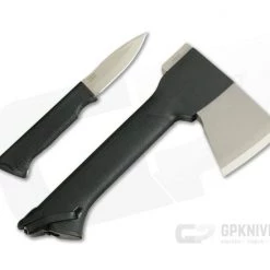 The knife fits securely in the handle of the axe and a nylon sheath is included for carry.