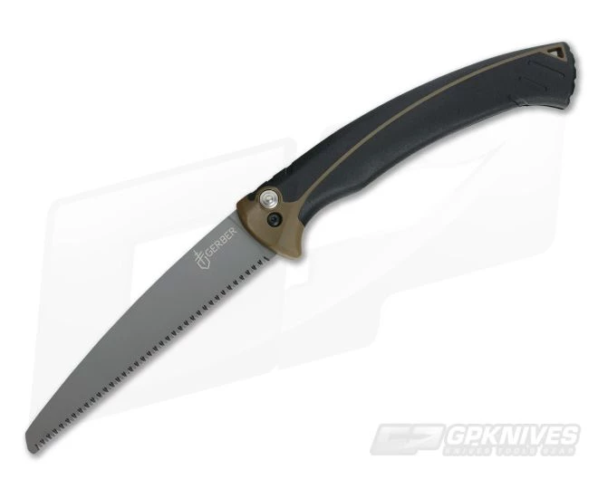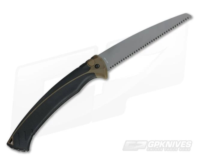 This simple, button lock folding saw from Gerber features a stainless steel blade that folds into a rugged handle. The handles are made with ridged steel liners inset in plastic and rubber overmold handles that offer a secure grip while still being very maneuverable in the hand. A simple button lock mechanism locks the blade in both open and closed positions for peerless security. The blade sports course and fine teeth and makes short work of bones, antlers, and wood alike.