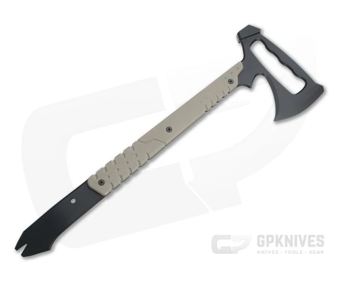 Handles:Â Attached over the full tang construction are durable and weather resistant tan G10 scales. Attached with stainless Allen bolts, the scales have peel-ply texture for solid traction with additional milled grooves for a secure grip regardless of the task or conditions. The end of the handle forms a robust pry bar with nail/pin puller with plenty of leverage via the cutaway handle in the head.