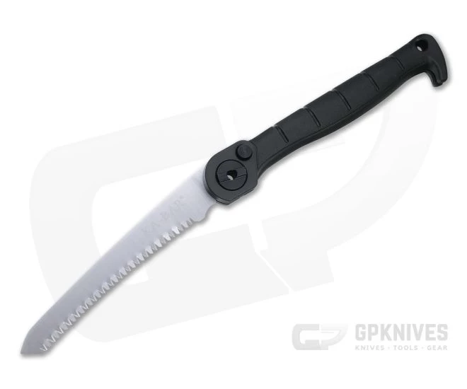 The Ka-Bar Folding Saw is a simple, button lock folding saw from Ka-Bar featuring a 65mn high carbon steel blade that folds into a rugged glass-reinforced nylon handle. Made in classic Ka-Bar style, the handles have a simple, comfortable design with TPR over mold and grooves for traction. A simple button lock mechanism locks the blade in both open and closed positions for unmatched security. This pull cut saw makes short work of bones, antlers, and wood alike.