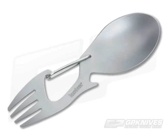 The Kershaw Knives Ration is a multi-tool for the masses. Whether you like to hunt, camp, hike, bike or eat lunch at your desk the Ration is the perfect companion. Featuring a fork, spoon, bottle opener and carabiner gate for attachment to just about anything. It’s bead-blast stainless steel construction will serve you many meals along the way.Â