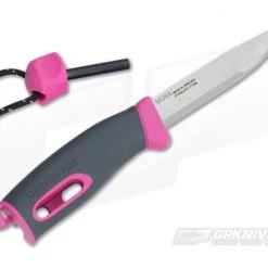 The Handle:Â TPE high friction rubber handle features offers superior grip for control during undesirable climates and situations. Easy to find two tone fuschia and gray for good looks, the handle also houses the integral Swedish FireSteel. Â