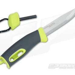 The Handle:Â TPE high friction rubber handle features offers superior grip for control during undesirable climates and situations. Easy to find two tone lime and gray for good looks, the handle also houses the integral Swedish FireSteel. Â