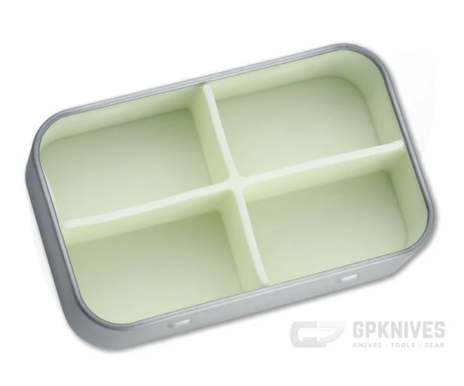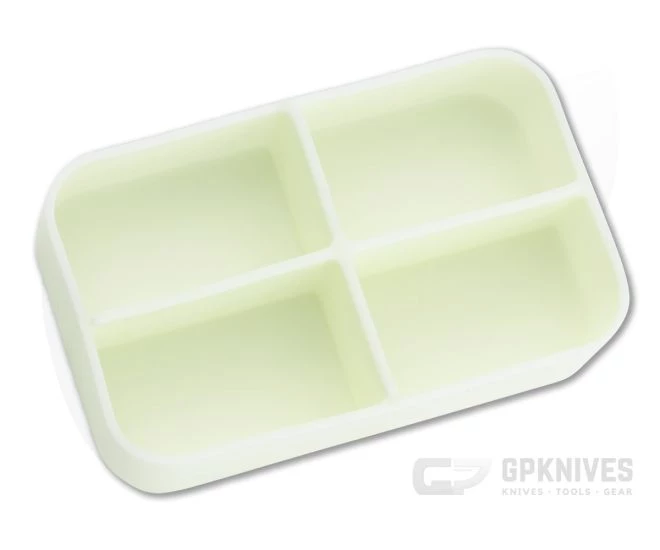Designed for use with the Maratac x CountyComm industrial strength food grade stainless steel survival tins (or similar sized mint tins) this silicon divider has four compartments to keep your small items organized within the tin. Silicone is non-magnetic, anti-static, flame/heat-resistant, solvent resistant and easy to clean with soap and water. Glow in the dark (GITD) silicone allows for easy low light indexing and ups the cool factor.