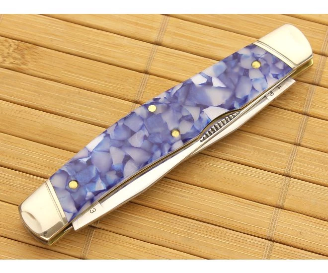 Brand new Northfield #81 Cooner Skinner by Great Eastern Cutlery is Serialized 1 of 25 made dressed in very cool Staffordshire Blue Acrylic. The acrylic is something to behold as it has a cold, cracked ice or glass appearance. The icy blue and white look like fragments of a stained glass window. Dual opposing 1095 carbon steel blades make the Coon Skinner a handy companion