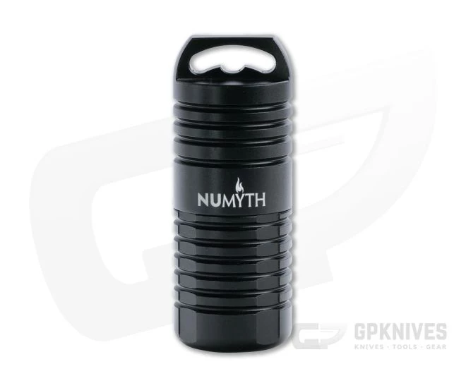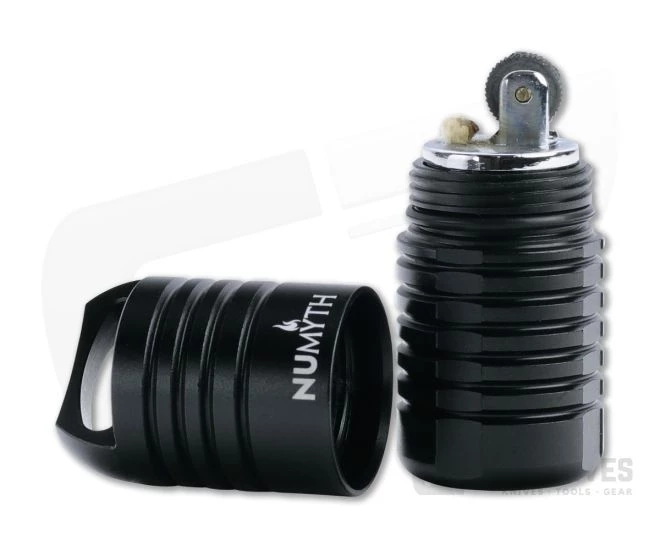 The Numyth Tohil is a compact and durable “peanut” style lighter CNC machined from aluminum alloy and finished with durable Type III hard anodization. Machined grooves and flats reduce weight and provide good traction for opening and closing the o-ring sealed cap which keeps the lighter fluid from drying out. The flat bottom allows use as a short term emergency candle. An oversized loop provides a lanyard/key ring attachment point. This version comes in classic black.