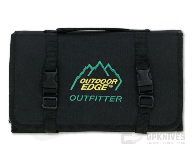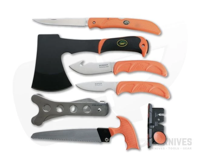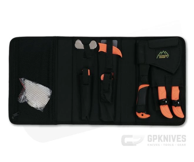 The Outfitter by Outdoor Edge, is a professional set with every hunting tool you can think of in a roll-pack organizer. The knives in the kit are manufactured with full tang 420 stainless steel blades with blaze orange kraton handles.The folding boning knife is constructed of 440A stainless and the axe is of 3Cr13 with a black oxide coating. Separate Nylon sheaths are included for the axe and skinner/caper combo. Includes a convenient Nylon roll-pack with a zipper compartment for gloves, and Velcro retaining straps for the other tools and sheaths.