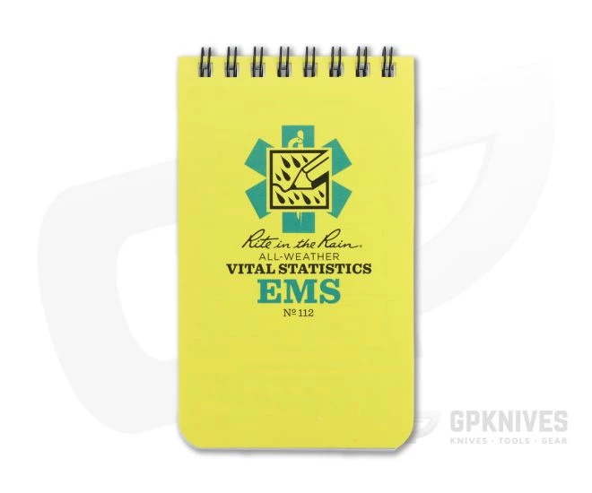 The Rite in the Rain No. 112 EMS Vital Stats Form All-Weather notebook has a durable, hi-viz yellow Polydura cover with wire bound white, 20# all-weather paper with blue ink. Each of the 50 sheets has a vital statistic form on the front and notes section on the back. Internal references included: Imperial & metric rulers and Rapid Triage procedures.