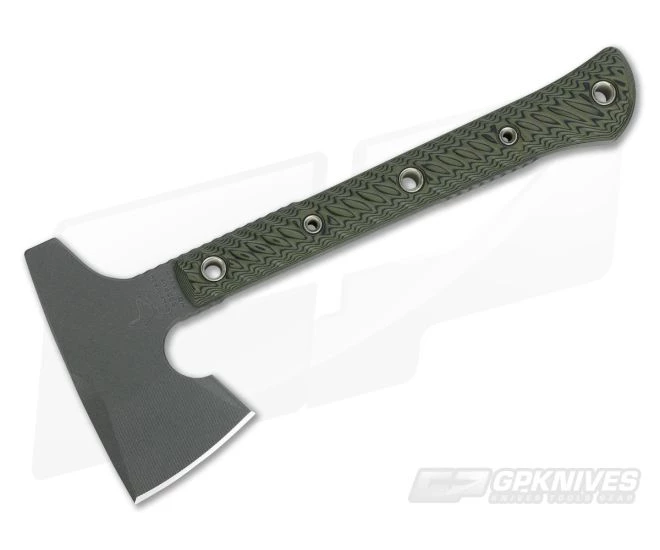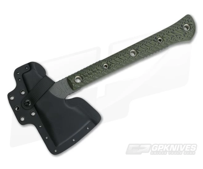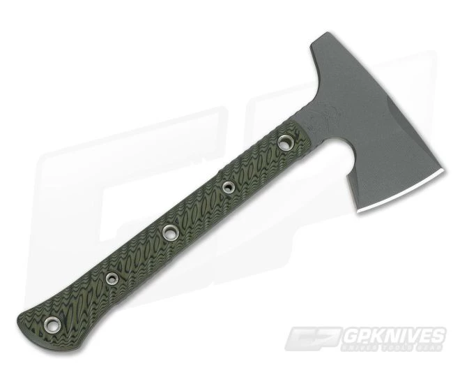 The Handle:Â 3D Machined ‘Dirty Olive” layered black and green G10 handle scales provide plenty of traction and are supported by a full tang I-Beam handle construction. Well balanced and fast in the hand the Jenny Wren handle has jimping for sight free indexing and 5 flared tubes for various lanyard attachment options. At just under a foot in length the Jenny Wren delivers plenty of leverage for powerful chopping power while still retaining a compact footprint for ease of carry.