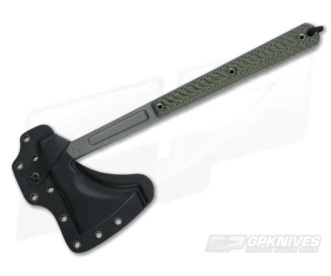The Handle:Â 3D Machined Dirty Olive (green and black) layered G10 handle scales provide plenty of traction and are supported by a full tang I-Beam handle construction. The handles of the Kestrel are deferentially heat treated to 30 HRC making it exceptionally tough. Well balanced and fast in the hand the Kestrel handle has jimping for sight free indexing and 3 flared tubes for various lanyard attachment options.