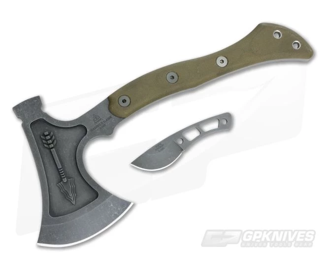 The TOPS Hammer Hawk was designed by TOPS Knives president Leo Espinoza in 30 minutes! This impressive design showcases a highly functional tomahawk design with a unique visual appeal thanks to eye catching Native American spear design milling which also reduces the overall weight. A hammer pole offers enhanced functionality and the contoured Micarta handles make for secure and comfortable chopping all day long. This version comes with a head and tang of Tungsten Cerakote coated 1075 carbon steel, green canvas Micarta handle scales and a compact Backup knife.