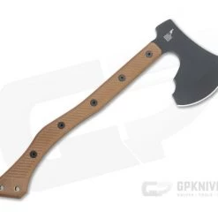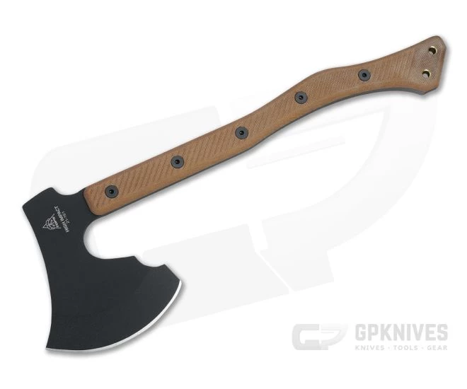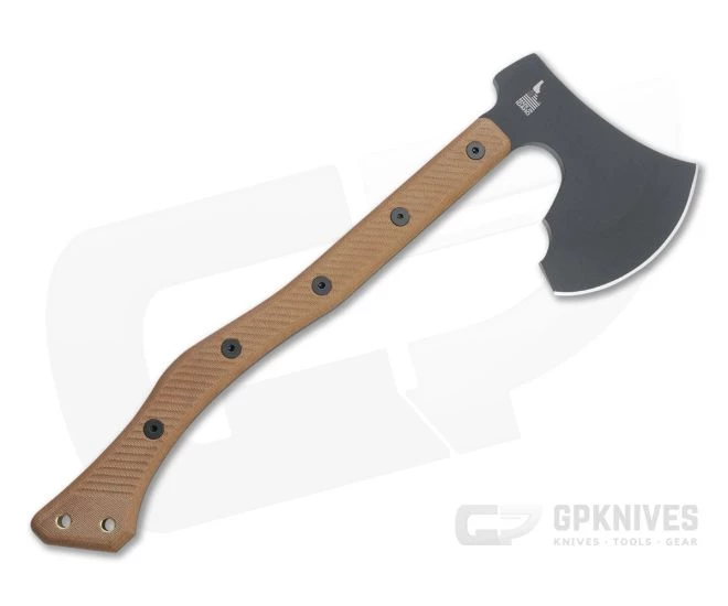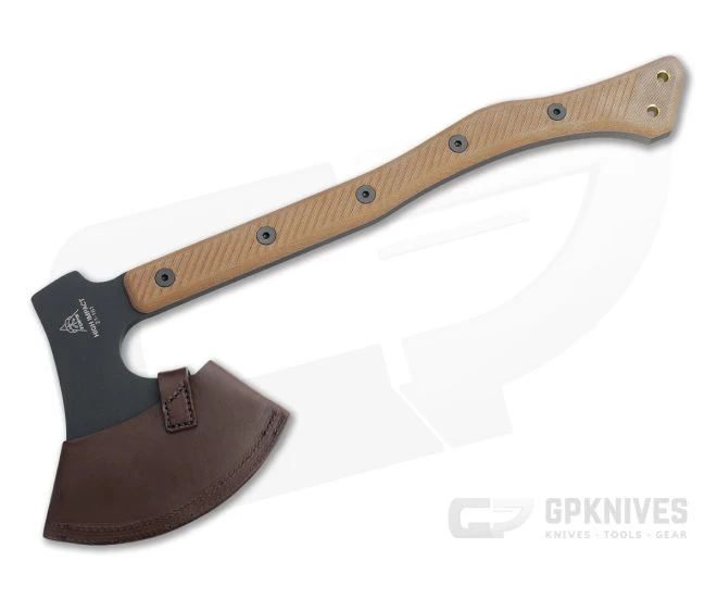 Handle: The handle follows classic lines with a sweeping crook backed design and prominent end knob for comfortable and efficient swinging with one or two hands. Tan canvas Micarta is durable, weather resistant and milled with grooves to offer high traction for an exceptionally secure grip even when wet. Ergonomically contoured, the scales are attached to the tang with large stainless bolts over contrasting red liners for a solid, balanced platform. The neck of the handle features cross milling between the bolts for comfort when gripping close to the head for fine work. Two holes at the end allow for lanyard attachment.