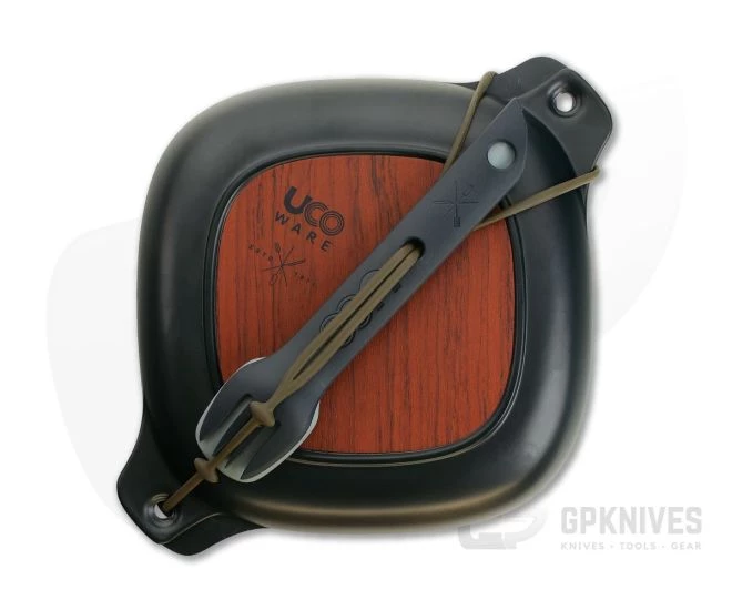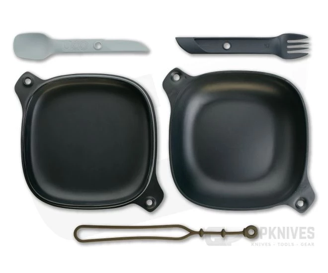 The UCO Five Piece Mess Kit Bamboo Elements is a sustainable, 90% Natural material (75% Bamboo Fibers + 15% Starch) mess kit new for 2019. Each kit includes 5 Pieces: 1 bowl/container, 1 lid/plate with silicone gasket, 1 Switch Spork Set, and 1 reusable tether. The Switch Spork Set offers 4 tools in 1: Full size spoon, fork and knife; connect the spoon and fork for extra length for reaching into the bottom of deep packages. The spoon edge radius is designed to fit perfectly into the corners of the container to get every morsel of food. The reusable tether holds everything together, can be used to hang dry the kit and clips easily to a carabiner.
